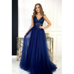 Tieto luxusné šaty v odtieni tmavomodrej farby sú ideálnou voľbou na ples, stužkovú, svadbu alebo galavečer. Vrchná časť je bohato zdobená čipkou a jemnými korálkami, ktoré dodávajú šatám šmrnc a ženskosť. Výstrih v tvare písmena V elegantne zvýrazňuje dekolt, zatiaľ čo širšie ramienka poskytujú pohodlie a oporu. Priesvitné detaily v oblasti pásu opticky zoštíhľujú postavu a tylová sukňa s vysokým rozparkom pôsobí ľahko, vzdušne a zároveň zvodne. 🔒 Zadné zapínanie: Kombinácia šnurovania a skrytého zipsu zabezpečuje dokonalé prispôsobenie postave a jednoduché obliekanie. 📏 Strih a materiál: Dĺžka: dlhé až po zem Strih: princeznovský s rozparkom Materiál: tyl, čipka, podšívka Podšívka: áno Zapínanie: šnurovanie + zips (vzadu) 🎯 Tip: Skombinujte s jednoduchými lodičkami a trblietavými doplnkami pre dokonalý večerný look.